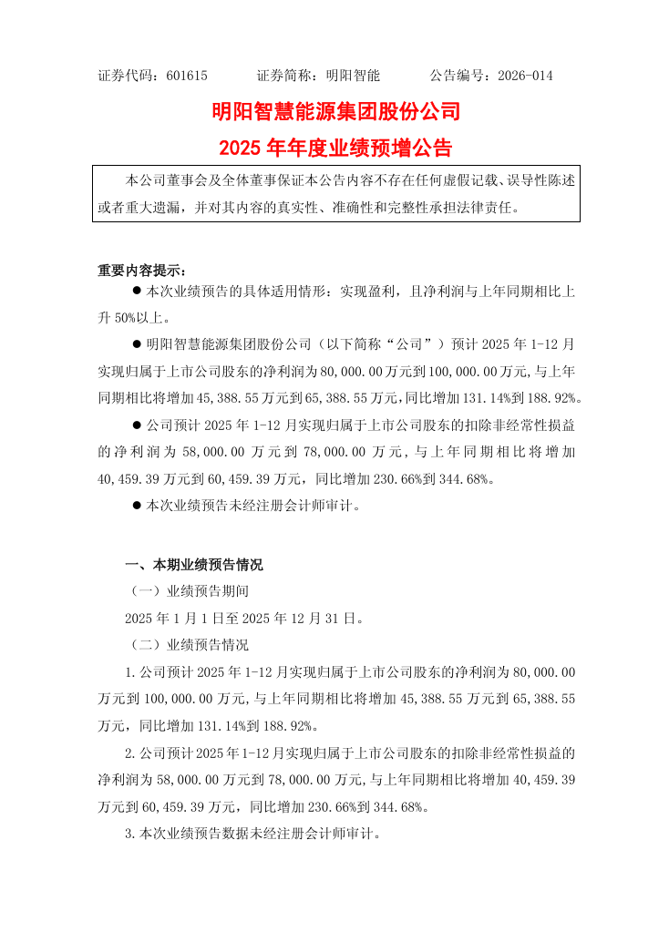 1月29日,明阳智慧能源集团股份公司(以下简称“明阳智能”或“公司”)发布《2025年年度业绩预增公告》。