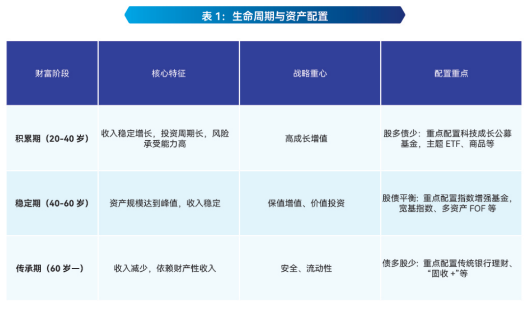 战略需随发展阶段而变革。投资同样需遵循生命周期理论,根据年龄、收入、风险承受能力的变化动态调整资产配置重心,以下为参考示例: