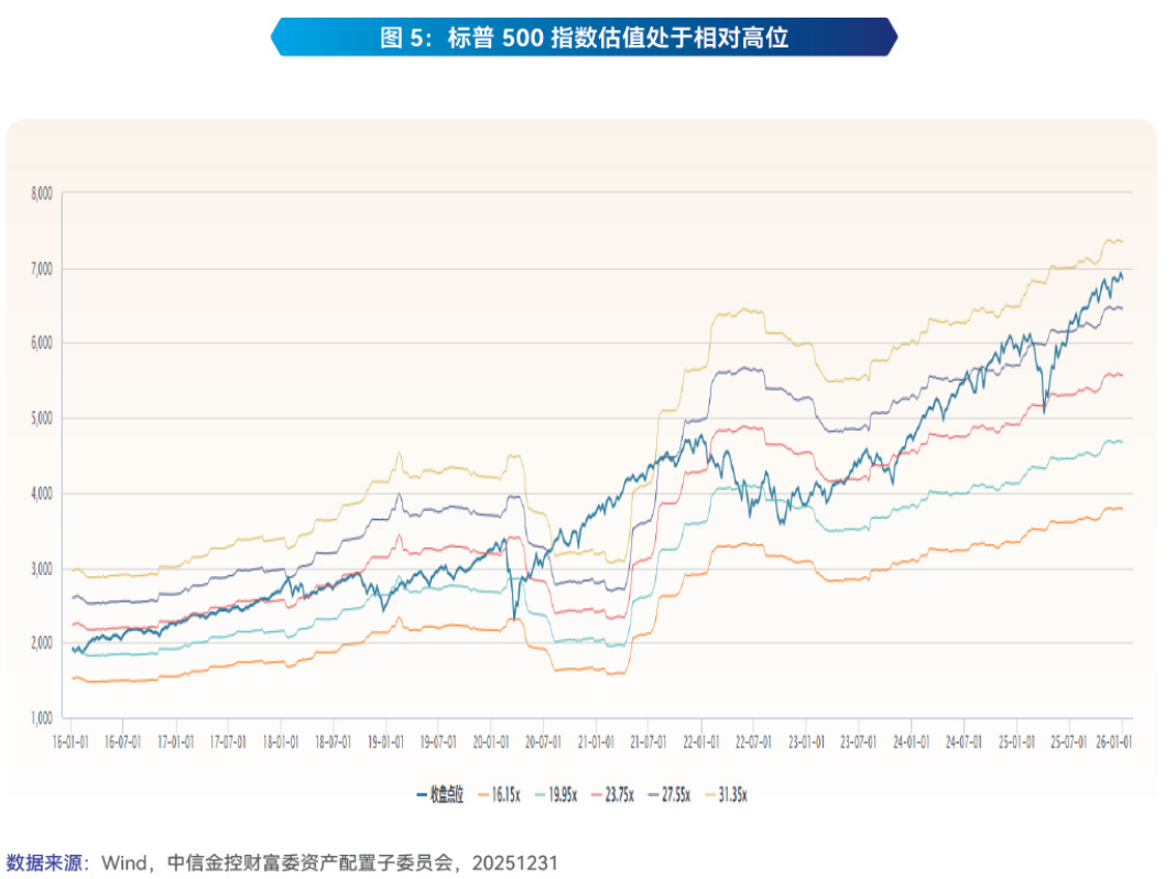 然而,当前主要市场指数估值已普遍处于历史高位,制约了指数整体大幅抬升的空间。具有代表性的标普500指数估值在27倍到31倍之间,处于相对高位(如图5),龙头公司的盈利预期扰动或宏观政策的阶段性不确定性,可能引发市场波动。此外,投资者还需警惕地缘政治冲突、政策博弈等外部因素带来的潜在干扰,均可能触发市场出现较大幅度的震荡调整。