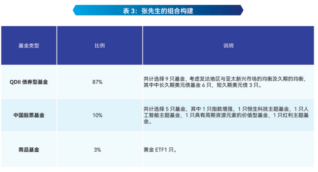 从设计学派(SWOT模型)角度,张先生的优势在于资金流动性较好、具备一定专业知识,且明确提出了海外债投资方向;劣势在于直接投资海外渠道有限,货币不可自由兑换;机会方面,美联储货币政策宽松,美债票息高于国内;威胁则包括美元汇率可能走低、地缘政治等因素。综合其特点,建议以公募QDII基金为主要投资工具,辅以少量中国权益类基金与商品基金,以对冲美元汇率风险。从结构学派角度,张先生处于财富稳定期,可适当进行股债平衡配置。从环境学派角度,由于该笔资金由固收转换而来,且明确主要投资海外债,在大类资产配置上,核心资产以海外债券公募基金为主,占比87%;卫星资产为中国权益资产(10%)与商品公募基金(3%)。“反脆弱”安排主要体现在通过权益资产与商品资产对冲人民币升值对美元债投资的潜在风险。
