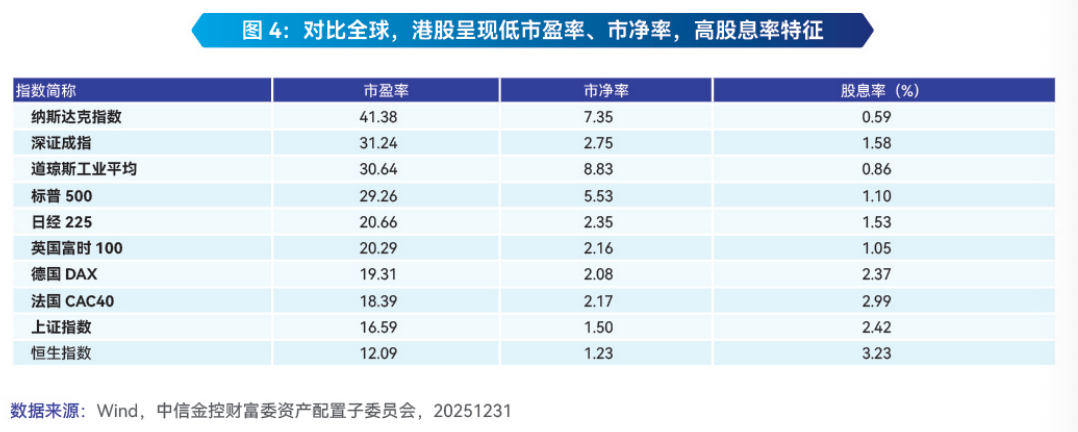 估值洼地是港股具备较强吸引力的基础。经过2025年四季度的调整,港股市盈率重新回到低位,并呈现高股息率特征(如图4),为市场提供了充足的安全边际和修复空间,这也是吸引长期资金配置的重要条件。