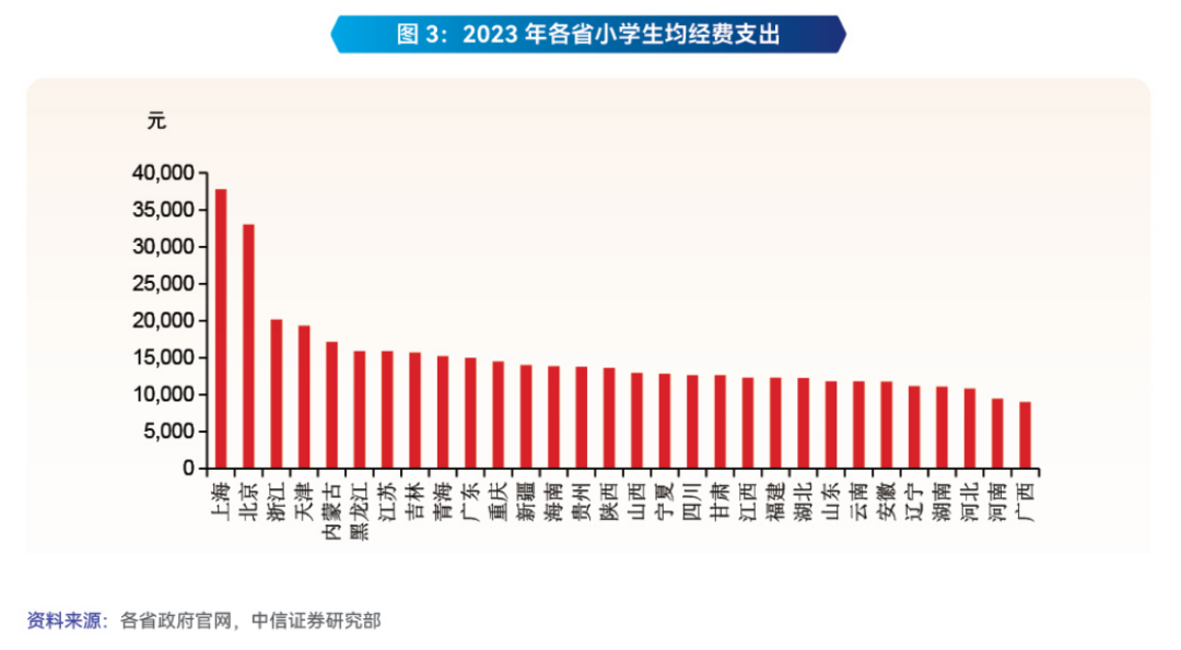 从促进人口高质量发展来看,“十五五”规划《建议》提出“探索延长义务教育年限”,根据我们统计的169个国家(地区)义务教育年限,截至2024年,有43个国家采用九年义务教育制,是我们所统计的国家(地区)中最为广泛采用的义务教育年限,且这43个国家经济发展水平跨度极大,人均GDP从1500国际元到10万国际元。我们认为,延长义务教育年限总体上迫切性不强,在“十五五”时期或仍处于“探索”阶段。但在“稳步推进基本公共服务均等化”的要求下,预计推动义务教育的均衡发展或是“十五五”时期需要着力解决的重点,根据我们的统计,2023年不同省份之间生均教育经费投入仍存在较大差距,以小学和初中为例,我们统计到的30个省份中生均教育经费投入最高的省份分别是最低省份的4.2倍和4.8倍。