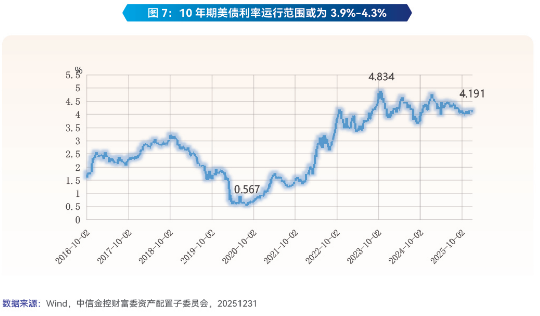 在美联储降息周期的推动下,美元债券仍具备一定的配置价值。美国经济预计将迎来温和回暖,明年全年实际GDP增速预计为1.9%。降息举措叠加其“大而美”法案对消费的刺激,将共同推动美国消费温和增长;同时,AI领域的投资热潮也将支撑私人投资企稳复苏。通胀方面,随着特朗普政府关税税率的实质性下调,关税对物价的扰动将逐步消退,通胀压力整体可控。在此宏观环境下,美联储在2026年仍有约50bps的降息空间,这将驱动短端美债利率下行,资本利得空间相对明确,10年期美债利率运行范围或为3.9%-4.3%(如图7)。