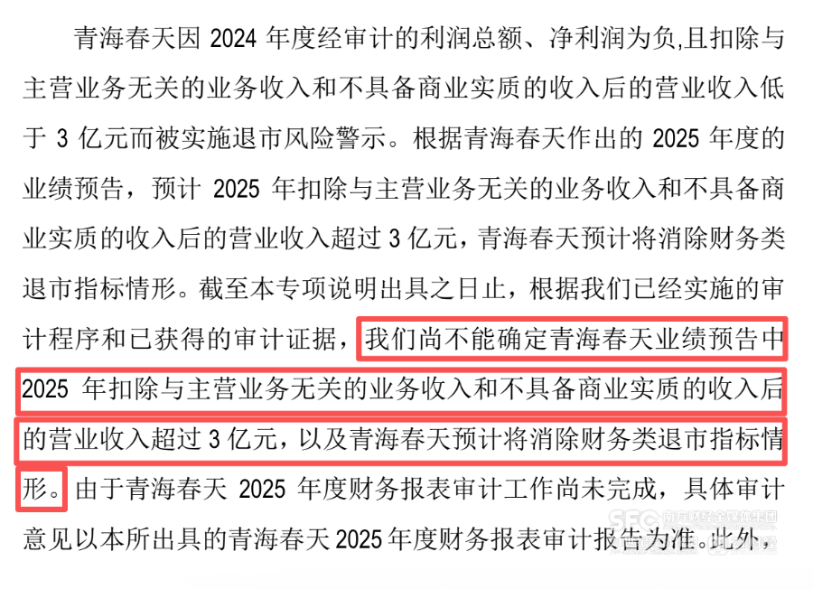 对于其业绩预告给出的营业收入数据,审计方政旦志远表示,“根据我们已经实施的审计程序和已获得的审计证据,我们尚不能确定青海春天业绩预告中2025年扣除与主营业务无关的业务收入和不具备商业实质的收入后的营业收入超过3亿元。”