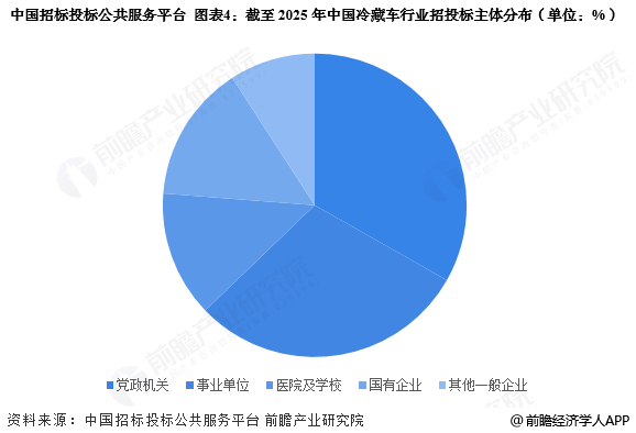 中国冷藏车行业招投标主体以党政机关和事业单位为主,截至2025年,招投标事件数量分别为5224件和4653件,合计占招投标事件总数的60%以上。