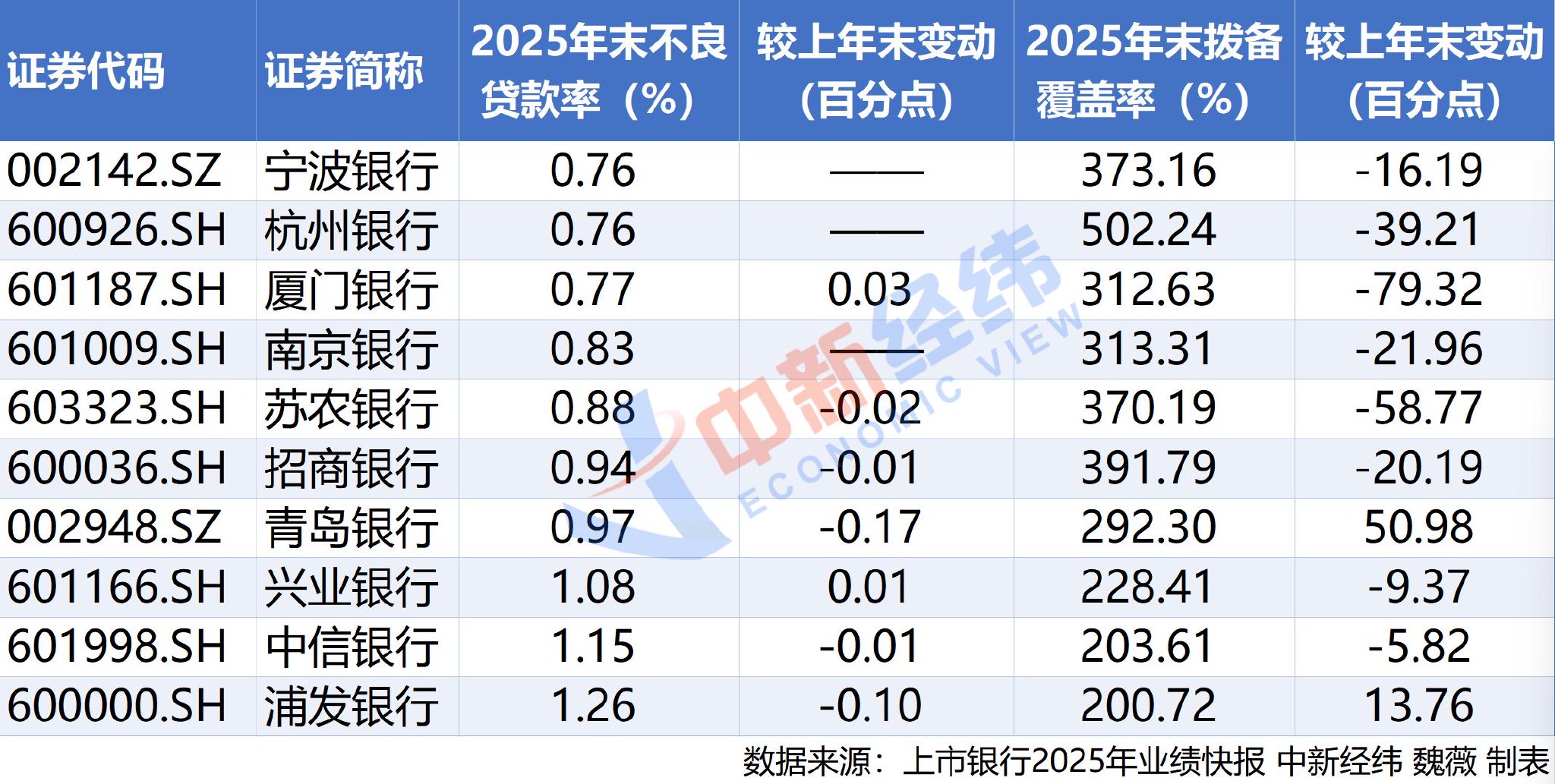 不过,中新经纬发现,10家披露2025年业绩快报的银行中,有8家拨备覆盖率均出现下降,青岛银行和浦发银行拨备覆盖率上升。