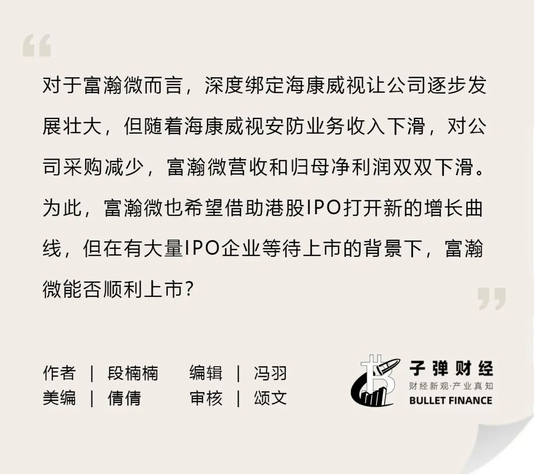 对于富瀚微而言,深度绑定海康威视让公司逐步发展壮大,但随着海康威视安防业务收入下滑,对公司采购减少,富瀚微营收和归母净利润双双下滑。为此,富瀚微也希望借助港股IPO打开新的增长曲线,但在有大量IPO企业等待上市的背景下,富瀚微能否顺利上市,「子弹财经」将持续保持关注。
