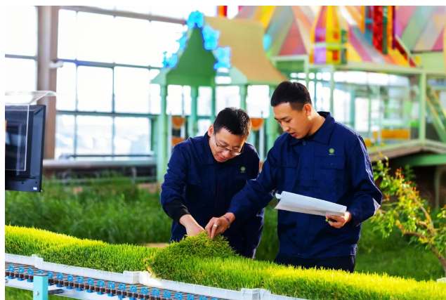 草业国家技术创新中心科研人员查看草品种实验情况。