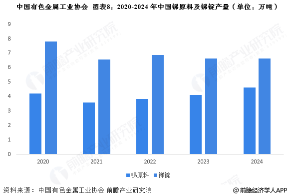 根据中国有色金属工业协会披露的数据,2020-2024年,我国锑原料产量从2020年的4.22万吨下降至2021年的3.58万吨后,逐年递增,2024年中国锑原料产量为4.62万吨,同比上升13.1%。2020-2024年中国锑锭产量总体下滑,由2020年的7.81万吨下降至2024年的6.65万吨,下滑幅度为15%。整体来看,中国锑品产量有所回升。