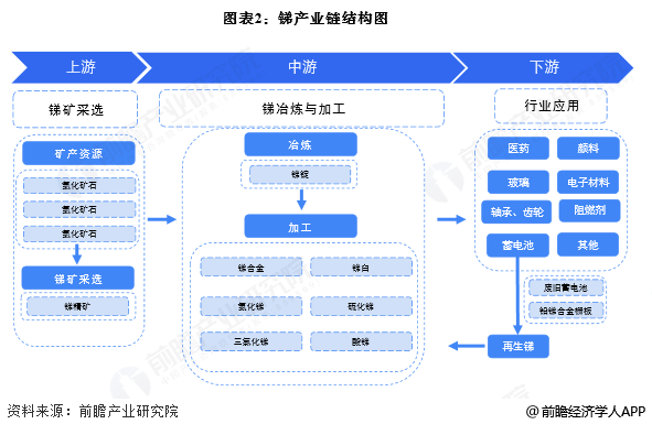 我国锑行业起步很早,目前已经形成了从采选到应用的完整的产业链,其中,再回收作为锑资源应用的重要一环,也是产业链中不可或缺的部分。锑产业链上游主要是锑矿的开采以及选取,产物为锑精矿;中游主要为锑的冶炼与加工,锑精矿经过冶炼后将成为锑锭,可以用来加工为高纯金属锑、锑合金、硫化锑等;下游应用主要包括阻燃剂、光伏玻璃、蓄电池等。此外,蓄电池中的锑可以进行回收,作为再生锑,重新进行冶炼和加工。
