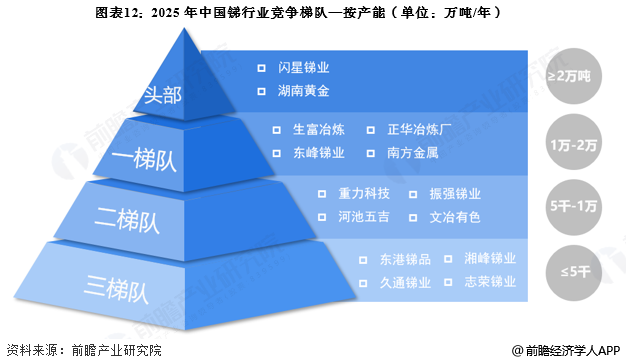 目前中国锑市场按照金属锑产能可以划分为四个梯队,其中头部梯队为产能大于1万吨/年的企业,包括闪星锑业以及湖南黄金。其中闪星锑业产能最高,达到3万吨/年,湖南黄金锑金属/锑锭产能为2.5万吨/年,排名第二。