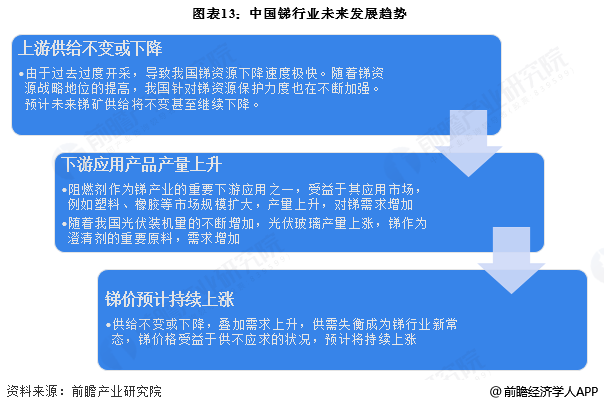 为了保护我国锑资源,确保我国锑行业可持续性发展,短期内我国锑供给量将维持不变甚至下调,然而下游需求市场,如阻燃剂、光伏玻璃等产量增加将使得锑需求上涨,从而导致供需缺口将进一步扩大,供需失衡或将成为锑行业新常态,预计锑价将持续上升。