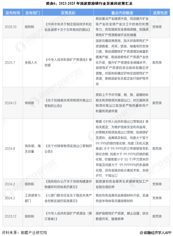 锑行业前期发展受限于工业水平,相关政策主要以开发和保护为主。随着我国工业水平的不断上升,以及西部大开发的不断深入,国家对于锑越发重视,尤其是当战略性新兴产业发展被提上日程后,锑产品的重要性越发得到体现;同时国家对于环境保护的要求越发提高,对于锑造成的污染也非常重视并制定了治理的相关目标及要求。