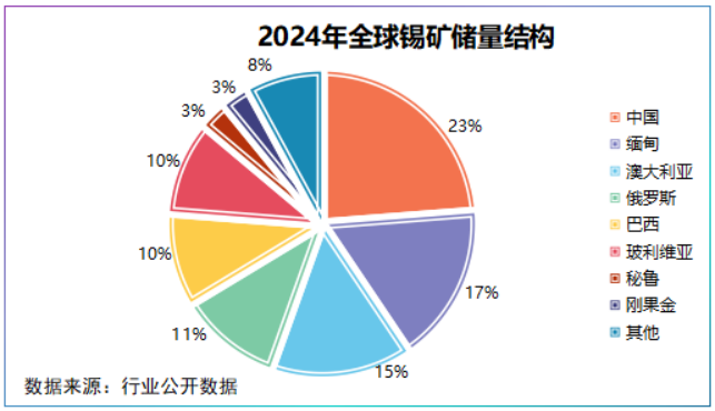 2024年全球已探明锡矿储量为420万吨,仅是铜的六分之一,并且呈现出小型矿床多、资源分散的特征。