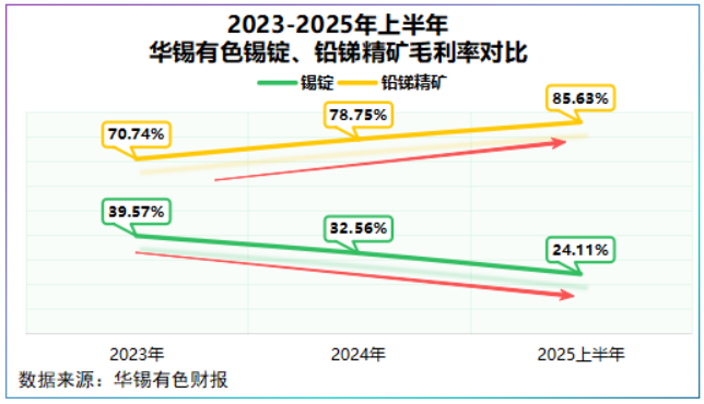 2023年以来,华锡有色锡锭毛利率从39.57%直线下滑至24.11%,相反铅锑精矿毛利率从70.74%跃升至85.63%,完美互补。
