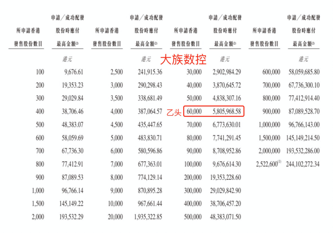 大族数控目前孖展25倍,最终大概率会超购300倍,甲乙组各25226手。申购人数按照10万人算,预估一手中签率5%,甲尾稳中一手。