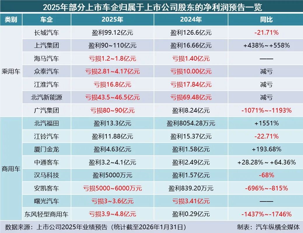 2026年1月,部分汽车类上市公司先后发布了2025年度的业绩预告。截至发稿前,中国汽车工业协会旗下汽车纵横全媒体跟踪到15家整车类上市公司,其中乘用车7家,商用车8家(比亚迪、长安汽车、赛力斯、一汽解放、中国重汽、宇通客车等主流车企尚未公布)。