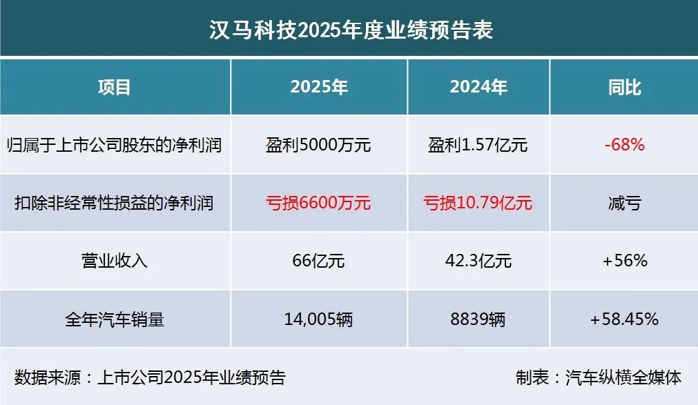 2026年1月17日,汉马科技集团股份有限公司(证券代码600375)发布了2025年度业绩预告。预告显示,汉马科技2025年归属于上市公司股东的净利润约为5000万元,与上年同期相比,大幅下降68%。同时,扣除非经常性损益的净利润仍然亏损6600万元左右,与上年同期相比,实现大幅减亏。