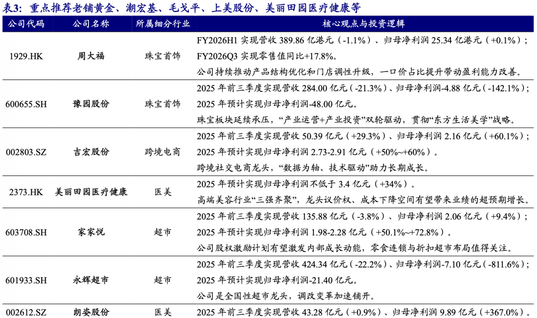 投资主线1:关注高端黄金和时尚黄金龙头品牌。黄金珠宝行业正在发生深刻变革,金价高涨、婚庆下滑,传统渠道品牌竞争力削弱,同时情绪消费兴起叠加社媒传播助力,部分具备差异化产品力和消费者洞察力的新兴产品型品牌崛起,在爆款打造、终端销售和加盟商开店等多维度验证竞争优势,品牌势能亦持续提升。建议关注高端中式黄金和年轻时尚黄金等细分赛道机会,重点推荐老铺黄金、潮宏基等,受益标的六福集团、周生生等。
