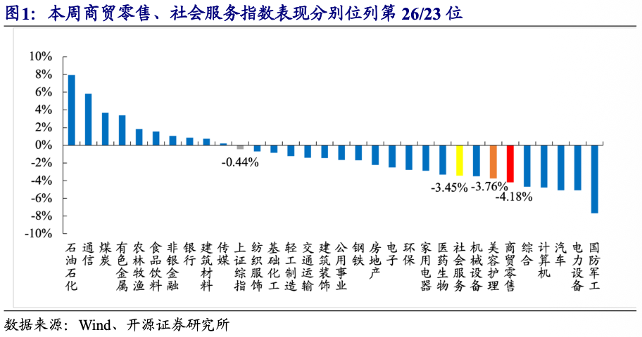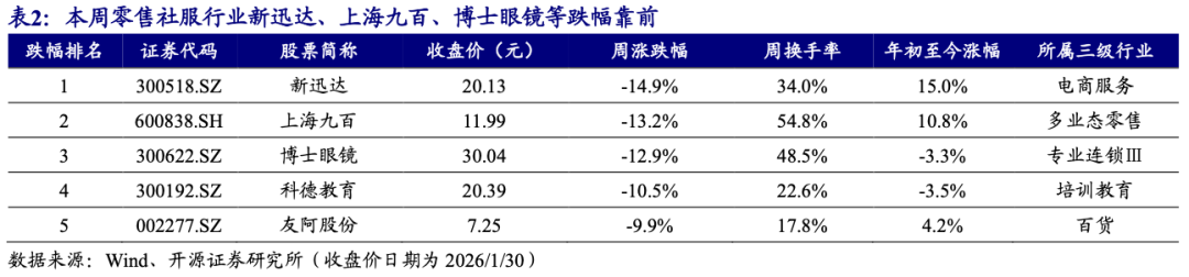 本周(1月26日-1月30日),商贸零售和社会服务指数分别报收2435.34点/9283.84点,分别下跌4.18%/下跌3.45%(同期上证综指累计下跌0.44%),在31个一级行业中分别位居第26/23位。商社各细分板块中,本周钟表珠宝板块涨幅最大,2026年年初至今钟表珠宝板块领跑。个股方面,本周黄山旅游(+7.2%)、怡亚通(+5.9%)、壹网壹创(+3.8%)涨幅靠前。
