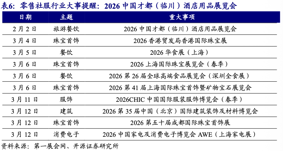 零售社服各细分板块中,钟表珠宝板块本周涨幅最大;2026年年初至今,钟表珠宝板块涨幅最大。在零售社服行业各主要细分板块(我们依据二级行业分类,选择较有代表性的超市、互联网电商、教育、专业连锁、百货、品牌化妆品、酒店餐饮、商业物业经营、钟表珠宝和旅游及景区10个细分板块)中,本周1个子板块上涨,其中钟表珠宝板块涨幅最大,周涨幅为7.07%;2026年全年来看,钟表珠宝板块年初至今累计涨幅为19.39%,在各细分板块中领跑。