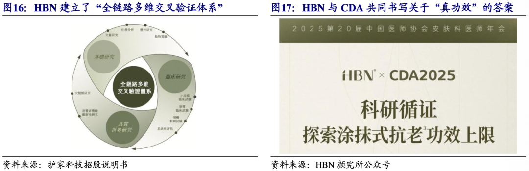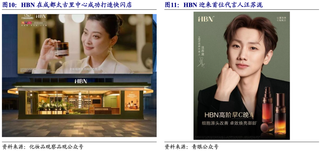 品牌端:通过“看得见的真功效”+“早C晚A”公式+权威实测奠定专业心智。HBN深挖成分党的痛点,将“早C晚A”这一复杂的护肤公式产品化、通俗化,确立了功效护肤的行业标杆地位。公司高度重视科学实证,拥有超过万名受试者参与的人体功效测试数据库。公司通过联合Discovery频道及央视网发布科学纪录片、发起SGS沙漠防晒挑战等活动,全方位构筑“让真功效名副其实”的信任壁垒,并通过KOL及KOC在主流社交媒体平台输出专业科普,持续巩固品牌权威性。此外,2025年成都太古里品牌快闪店的成功,有力验证了品牌在顶级线下商圈的扩张潜力。