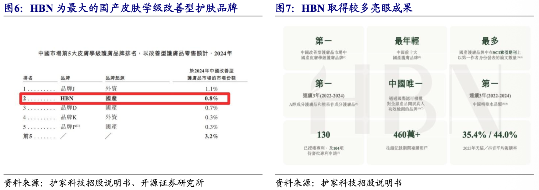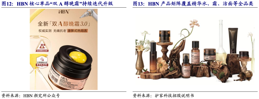 1月19日,护家科技(功效护肤品牌HBN母公司)正式向港交所递交招股书。HBN品牌成立于2019年,为国内“功效护肤”赛道领跑者。据公司招股书,按2024年零售额计算,公司为中国改善型护肤品市场中最大的国产皮肤学级护肤品牌。HBN围绕品牌心智、产品体系、渠道模式与科研能力构建了较为完整的竞争壁垒:(1)品牌端,HBN通过“看得见的真功效”、“早 C 晚 A”公式及权威实测建立专业心智,成都太古里快闪店的成功验证了品牌在高端线下商圈的扩张潜力;(2)产品端,HBN以“A醇”大单品策略为核心,围绕“早 C 晚 A”构建覆盖多使用场景的功效矩阵,已在视黄醇护肤领域形成领先优势;(3)渠道端,HBN以DTC直销模式为核心,深耕抖音、天猫等关键平台,通过精细化运营绑定高价值客群并实现高复购;(4)研发端,HBN采用“内部研发+合作研发”的双轨模式,搭建专业研发平台并形成跨学科科研团队,在功效护肤领域持续积累科研成果。我们认为公司核心壁垒体现在品类定义与大单品心智、直营模式下的用户运营优势、科研实证与技术三个方面,未来有望持续领跑中国功效护肤市场。