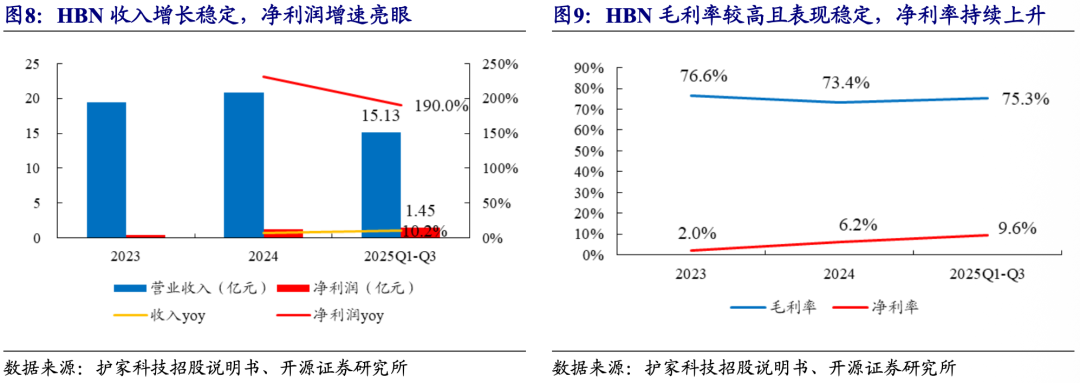 HBN改善型护肤品业务和线上直销渠道贡献核心营收。分业务看,2025年前三季度公司总收入达15.1亿元,同比增长10.2%,其中高功效的“改善型护肤品”营收占比达78.6%。HBN聚焦于面部功效护肤,基本盘由“双A醇晚霜”“α-熊果苷发光水”等大单品支撑。分渠道看,2025年前三季度线上/线下渠道收入占比分别为95.1%/4.9%,其中线上直销模式是核心引擎,营收占比高达84.0%。公司毛利率稳居高位,2025年前三季度综合毛利率75.3%,其中线上、线下毛利率分别为75.9%/62.8%。