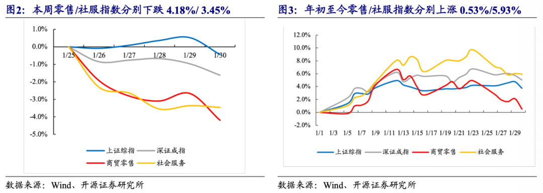 本周(1月26日-1月30日)A股下跌,商贸零售和社会服务指数分别下跌4.18%/下跌3.45%。本周上证综指报收4117.95点,周累计下跌0.44%;深证成指报收14205.89点,周下跌1.62%;本周全部31个一级行业中,表现排名前三位的分别为石油石化、通信和煤炭。具体看,商贸零售和社会服务指数本周分别报收2435.34点/9283.84点,分别下跌4.18%/下跌3.45%,在所有一级行业中分别位列第26/23位。2026年年初至今,上证综指累计上涨3.76%,商贸零售指数累计上涨0.53%,社会服务指数累计上涨5.93%。