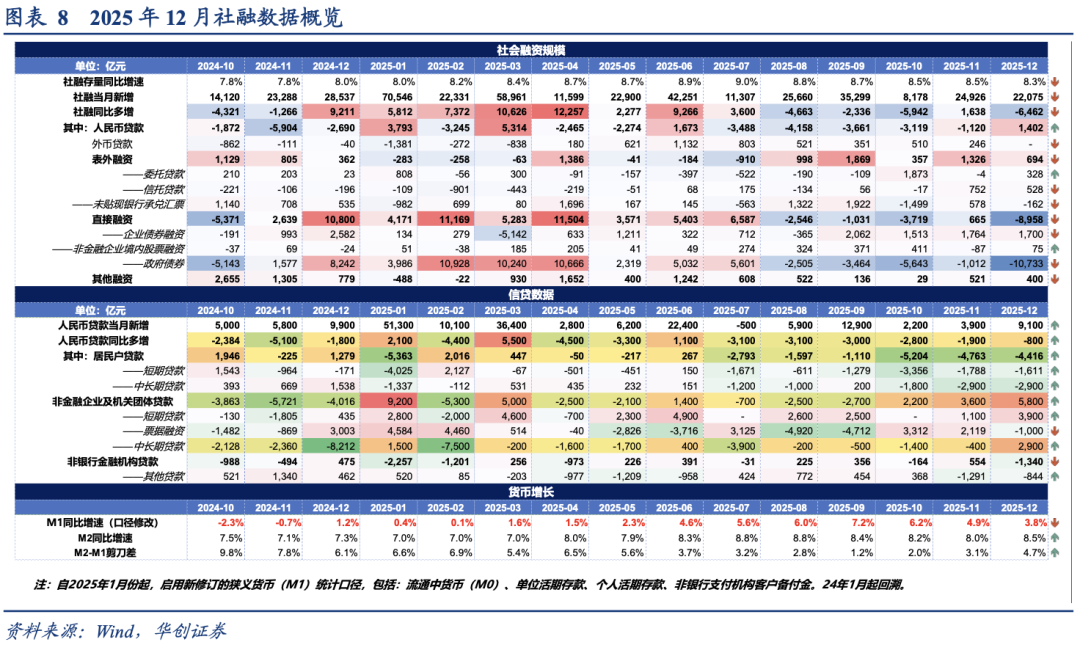 高基数下M 1 增速回落,非银存款同比高增。2025年12月M1同比增速环比回落1.1pct至3.8%,主要由于去年同期地方化债和偿还欠款等因素推高企业活期存款造成高基数。M2增速上升至8.5%,或主要由于银行负债端结构调整,存款定期化趋势延续。年末一般是银行集中揽储的时候,但12月企业存款同比少增(高基数),而非银存款同比高增。居民/企业/政府/非银存款分别同比+3900/-5857/+2904/+28400亿元。非银存款同比高增,一方面是由于同业存款利率自律规定导致非银存款流失造成低基数;另一方面则是25年末资本市场活跃吸引“存款搬家”。预计26年1月份资本市场仍将吸引部分存款资金入市,推动非银存款继续增长。