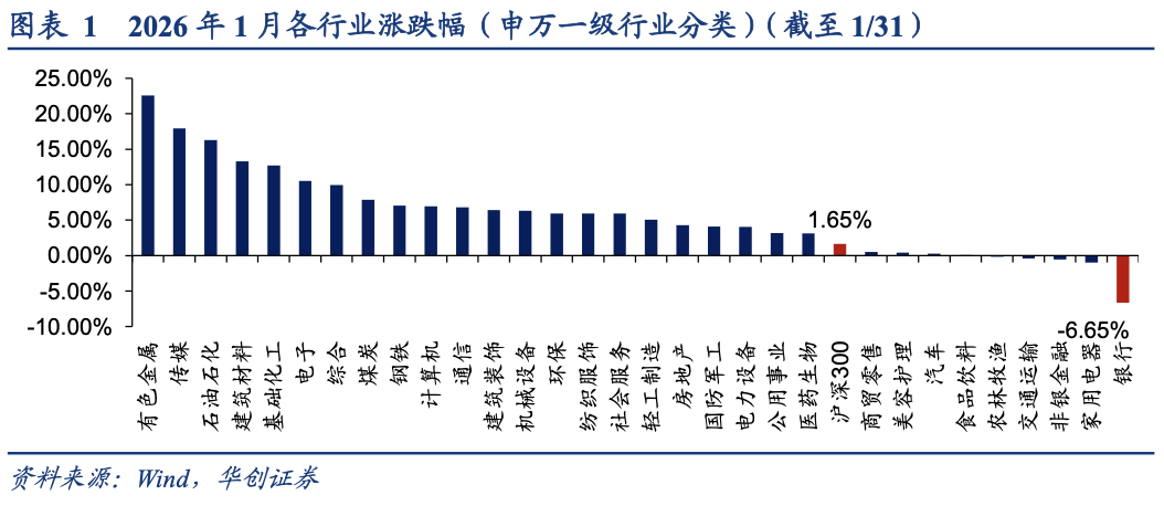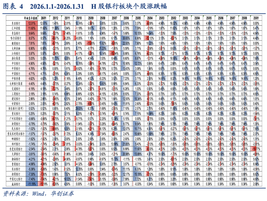 2026年1月1日至1月31日,银行业累计下跌6.65%,跑输沪深300指数8.3pct,涨跌幅在31个申万一级行业中排名第31。26年初,由于国产AI大模型应用密集突破,以及黄金白银等有色金属大涨,资金从防御性的银行股流向有色金属、传媒、科技等高弹性板块。