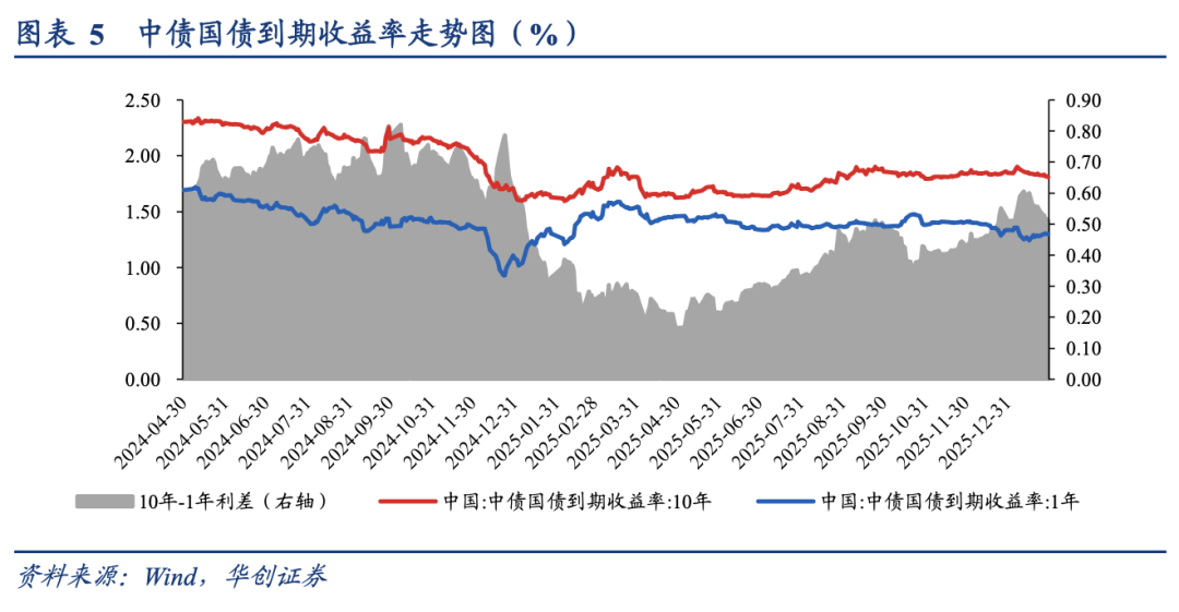 2026年1月,10年期国债利率走低,1年期国债利率则先下后上。1月,10年期国债利率月初升至1.90%,后续下行至月末的1.81%的水平,或主要由于债券供需结构变化以及货币政策宽松预期。1年期国债利率则从月初的1.33%降至中旬的1.27%,后续则回升至月末的1.30%左右。