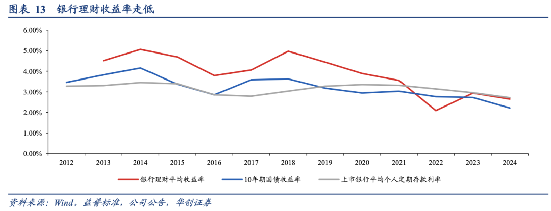银行理财收益率走低,打通入市卡点可提升吸引力。根据益普标准数据,2018-2024年银行理财平均收益率整体呈现下行趋势,并且2022年由于资管新规落地,理财产品打破刚兑导致估值波动,银行理财平均收益率自2012年以来首次低于上市银行平均个人定存利率,23、24年银行理财收益率虽有反弹,但也并未高于上市银行平均个人定存利率。在居民金融资产配置中,银行理财与定期存款均属于低波稳健型产品,但从近三年的收益回报来看,银行理财对于个人投资者的吸引力并未高于中长期定期存款。