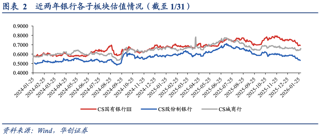 月度行情表现:2026年1月银行板块继续下跌。1)行业涨跌幅:2026年1月1日至1月31日,银行业累计下跌6.65%,跑输沪深300指数8.3pct,涨跌幅在31个申万一级行业中排名第31。26年初,由于国产AI大模型应用密集突破,以及黄金白银等有色金属大涨,资金从防御性的银行股流向有色金属、传媒、科技等高弹性板块。2026年1月1日至1月31日期间,各子板块估值均有回调,国有行和股份行更为明显。国有行PB估值从月初的0.75X降至月末0.69X左右,股份行的PB估值从月初的0.59X降至月末的0.54X,城商行PB估值下降后有所回升,月初月末均在0.66X左右。1月1日至1月31日,绩优城农商行涨幅居前。涨幅靠前的银行为青岛银行(+16.52%)、宁波银行(+10.18%)、杭州银行(+5.76%)、常熟银行(+3.69%)、渝农商行(+3.61%)。跌幅较多的主要是浦发银行(-19.29%)、农业银行(-12.50%)、兴业银行(-11.21%)、交通银行(-8.69%)、工商银行(-8.58%)。2)利率环境:1月,10年期国债利率月初升至1.90%,后续下行至月末的1.81%的水平,或主要由于债券供需结构变化以及货币政策宽松预期。1年期国债利率则从月初的1.33%降至中旬的1.27%,后续则回升至月末的1.30%左右。3)行业成交额:截止1月31日,资本市场交投活跃,银行板块成交额同比上升60.7%,占比AB股市场总成交额1.16%,环比下降0.13pct,主要是市场风格切换。4)行业估值:截止1月31日,银行板块(申万银行指数,801780.SI)整体PE 为5.98 倍,近10 年历史分位数30.59%,PB 为0.51倍,历史分位数21.67%。股息率4.50%,历史分位点51.18%。