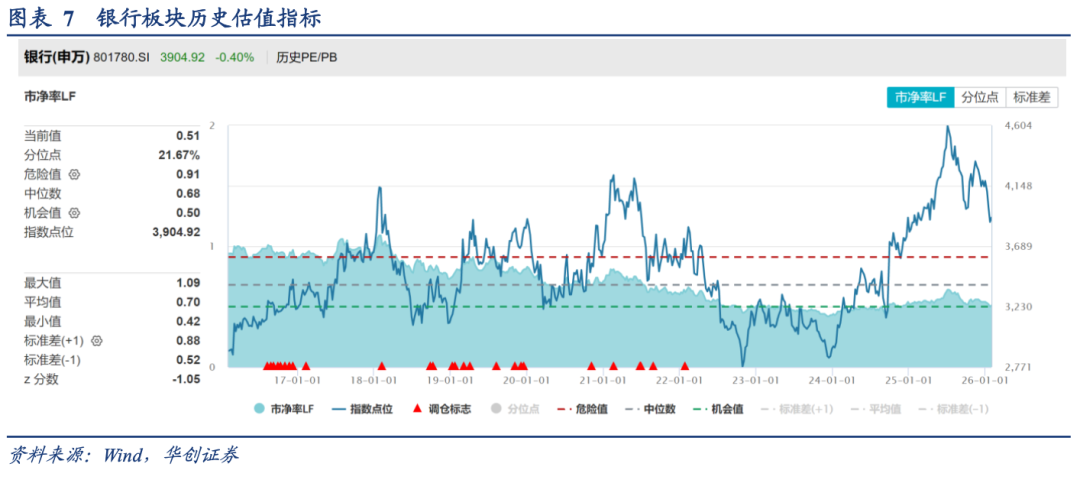 银行板块当前估值处历史偏低分位。截止1月31日,银行板块(申万银行指数,801780.SI)整体PE 为5.98 倍,近10 年历史分位数30.59%,PB 为0.51倍,历史分位数21.67%。股息率4.50%,历史分位点51.18%。