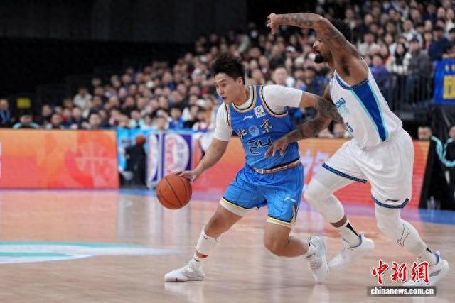 2月1日,2025-2026赛季中国男子篮球职业联赛(CBA)常规赛,北京北汽队主场87:89不敌青岛崂山啤酒队。图为北京北汽队赵睿(蓝衣)带球进攻。 中新社记者 张祥毅 摄