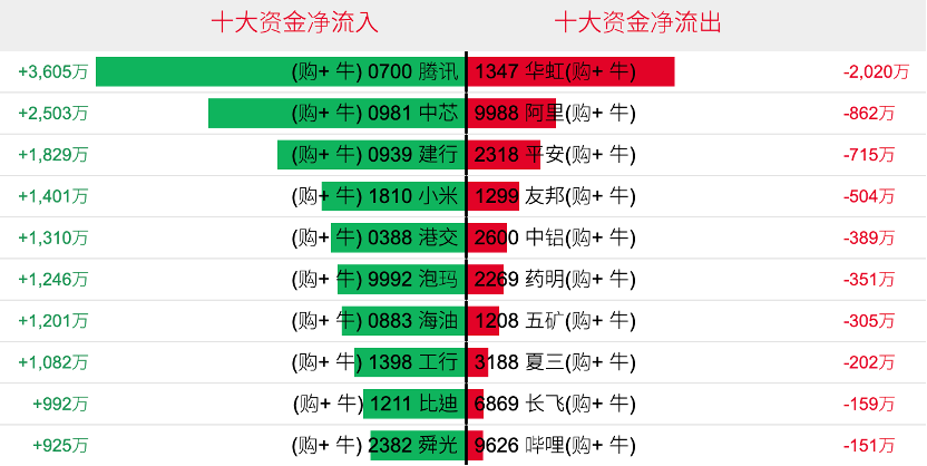 好仓(认购证及牛证)方面,过去5日,腾讯相关好仓录得约3605万港元资金净流入,为最大资金流入标的,中芯国际、建设银行及小米集团等相关好仓也分别约2503万、1829万以及1401万港元资金净流入部署;华虹半导体、阿里巴巴以及中国平安等相关好仓则分别约2020万、862万及715万港元资金净流出套现。
