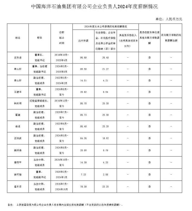 中国海洋石油集团有限公司企业负责人2024年度薪酬情况