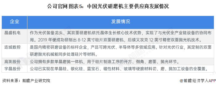 中国光伏硅片研磨机领域主要供应商包括晶盛机电、连城数控、高测股份、宇晶股份等,上述企业研发并生产多款光伏硅片研磨设备,包括磨抛一体机、大尺寸双面研磨机等。