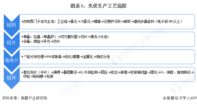 光伏生产工艺流程可分为“硅料→硅片→电池片→组件”四大环节,各环节主要流程如下: