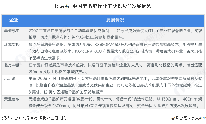 单晶炉领域供应商包括晶盛机电、连城数控等