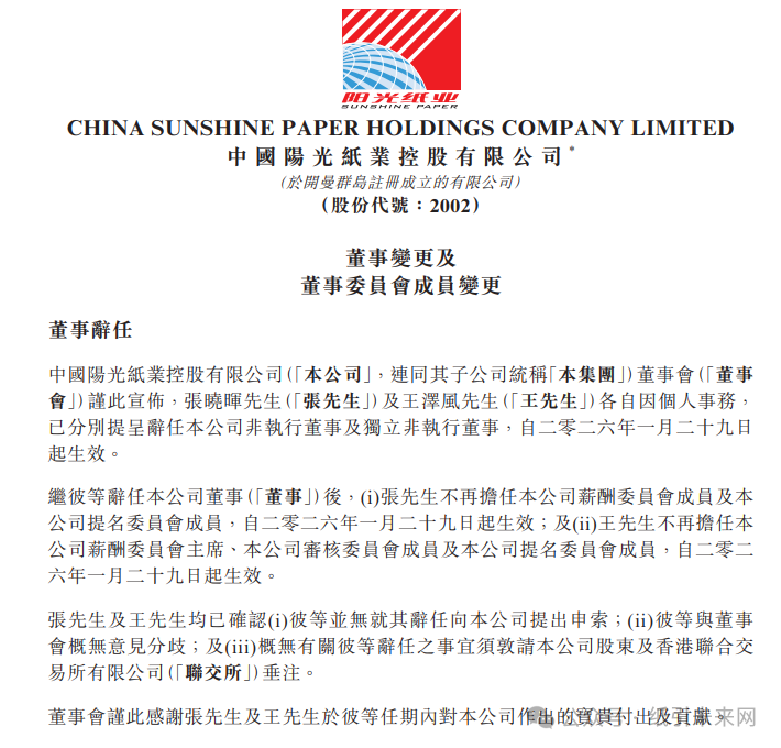 阳光纸业发布公告,董事会宣布,陈东旭先生(陈先生)及李恒源先生(李先生)各自分别已获委任为公司非执行董事及独立非执行董事,自2026年1月29日起生效。