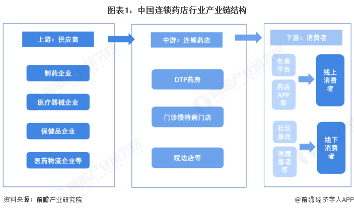 连锁药店产业链上游主要为制造企业、医疗器械生产企业、保健品生产企业以及医药物流供应商等;中游为连锁药店;连锁药店下游主要为线下客户和线上客户,线上客户通过医药电商平台、药店APP等需求获得。