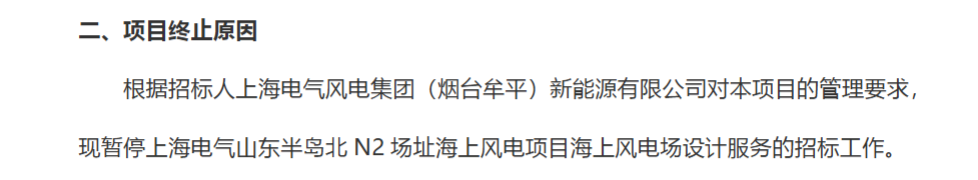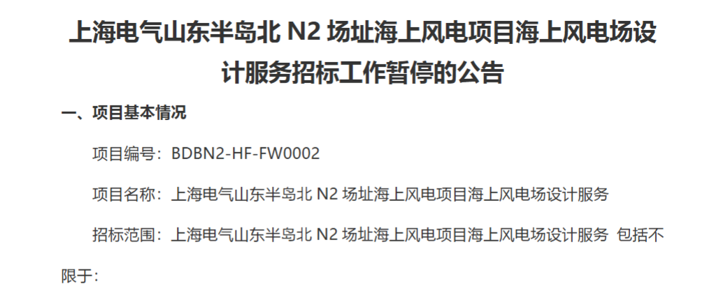 「风电之音」获悉,近日,上海电气山东半岛北N2场址海上风电项目海上风电场设计服务招标工作暂停的公告发布。