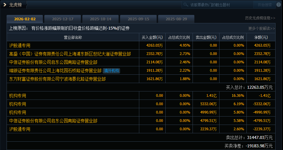 开普云今日20cm跌停,成交额8.61亿元,换手率6.03%,盘后龙虎榜数据显示,沪股通专用席位买入4263.05万元并卖出2239.37万元,有3家机构专用席位净卖出2.44亿元。