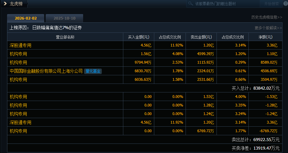 锡业股份(000960)今日跌停,成交额38.29亿元,换手率6.33%,盘后龙虎榜数据显示,深股通专用席位买入4.56亿元并卖出1.20亿元,3家机构专用席位净买入2.31亿元,有4家机构专用席位净卖出4.73亿元。