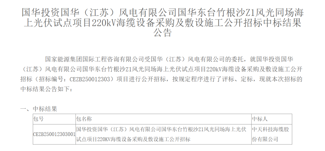 2月2日,国能e招发布《国华投资国华(江苏)风电有限公司国华东台竹根沙Z1风光同场海上光伏试点项目220kV海缆设备采购及敷设施工公开招标中标结果公告》。