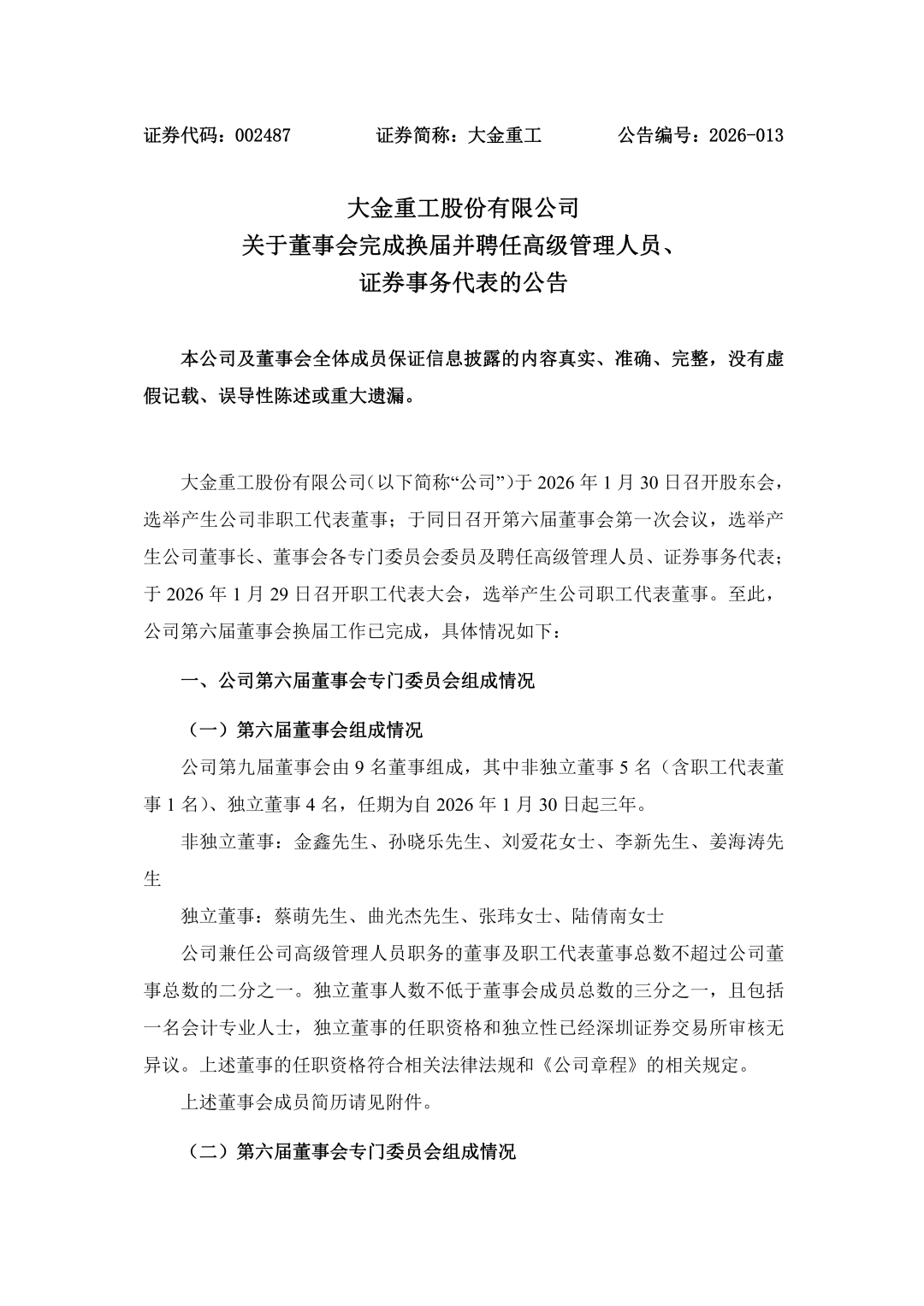 公告显示,大金重工于2026年1月30日召开股东会,选举产生公司非职工代表董事;于同日召开第六届董事会第一次会议,选举产生公司董事长、董事会各专门委员会委员及聘任高级管理人员、证券事务代表。
