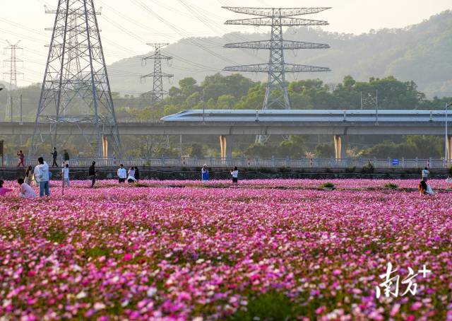 2月2日,中山市崖口村,春意盎然的花海上,高铁正向远方前行。