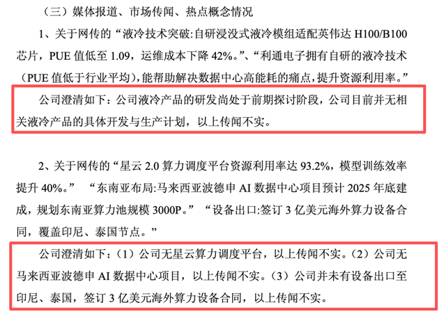 关于网传的该公司“星云2.0算力调度平台资源利用率达93.2%,模型训练效率提升40%”,“东南亚布局:马来西亚波德申AI数据中心项目预计2025年底建成,规划东南亚算力池规模3000P”,“设备出口:签订3亿美元海外算力设备合同,覆盖印尼、泰国节点。”公司明确表态:无星云算力调度平台,无马来西亚波德申AI数据中心项目,并未有设备出口至印尼、泰国或签订3亿美元海外算力设备合同,以上传闻均不实。